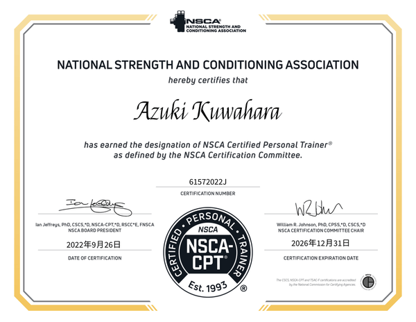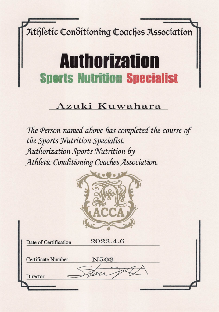 PMA認定資格RRS30 / NSCA-CPT / アスレティックコンディショニングコーチズ協会認定スポーツ栄養スペシャリスト /