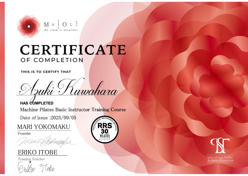 もともと私は、体型管理や健康のために筋トレに励んでいました。しかし、トレーニングを続ける中で「もっとしなやかで、内側から整った体になりたい」と考えるようになり、ピラティスの世界へ。マシンピラティスによって自分の体が劇的に変わっていく楽しさを知り、その魅力に深くのめり込みました。